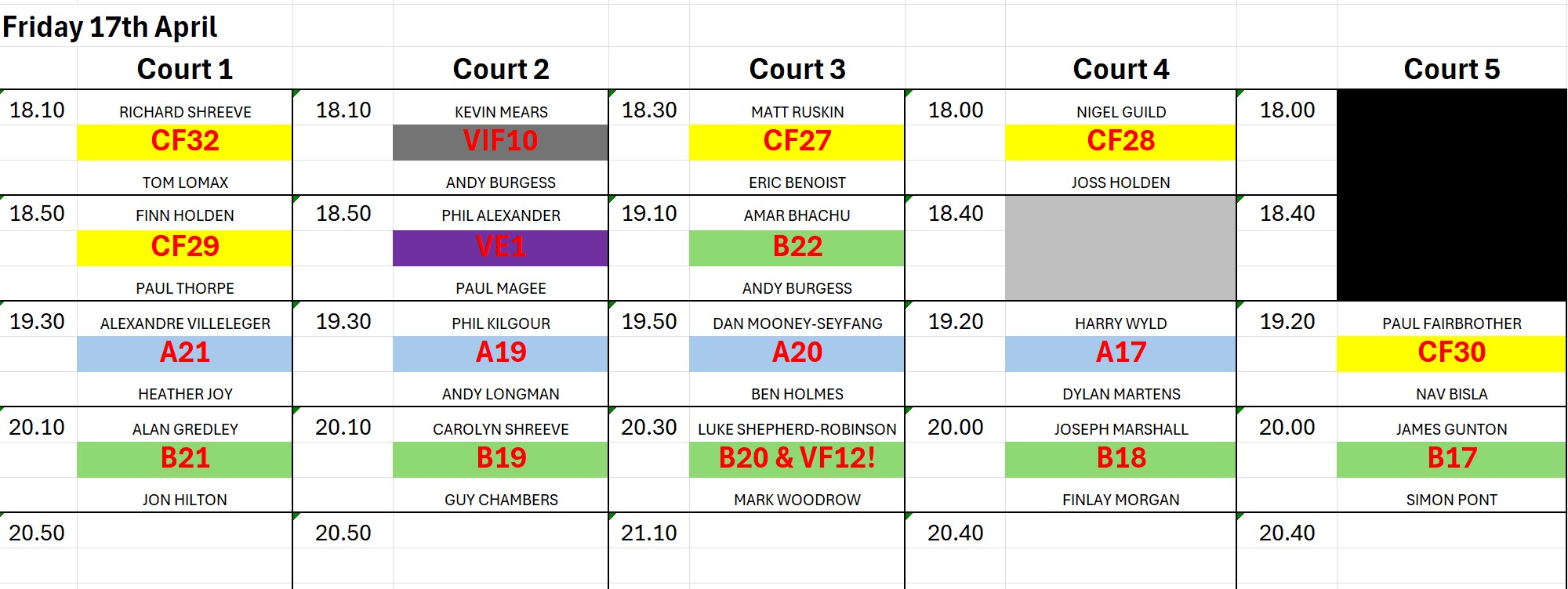Best of luck to all who are playing tonight - Please do come and make it a great atmosphere up on the balcony - support and spectate, score some matches and generally socialise the night away! Matches start from 6p.m. so we hope to see you later on!